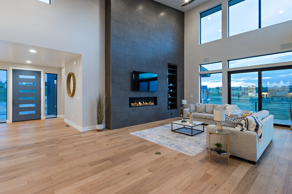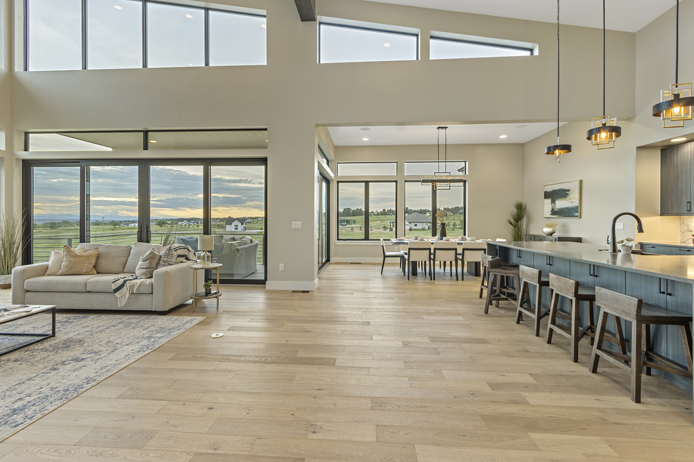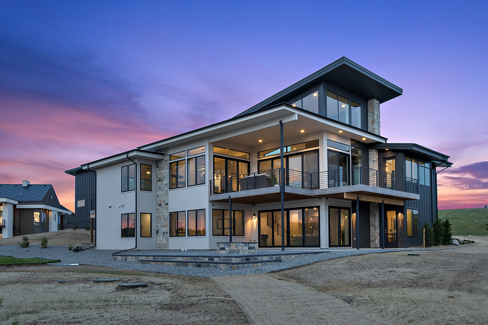 Located in the Fox Hill neighborhood in Franktown, CO. This Fox Hill 2021 Showcase home has solar power and geothermal heating and cooling; its HERS Index Score came in at -3. Modern ranch design has open floorplan with large windows and multiple walkout decks. Fully finished basement with second laundry room, wet bar and wine storage.