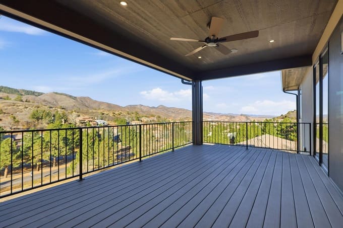 Material selection was driven by both performance and aesthetics. The exterior reflects a Colorado Contemporary style that feels appropriate to its setting while remaining timeless. Fire-resistant, hail-resistant metal shingles provide exceptional durability and echo the look of traditional tile roofing. Stucco finishes offer clean lines and low maintenance, while custom rod iron railings, posts, and beams add architectural depth without excess ornamentation.